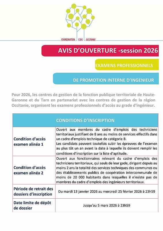 Les centres de gestion de la Haute-Garonne et du Tarn en partenariat avec les centres de gestion de la Région Occitanie organise en 2026, les examens professionnels, de promotion interne au grade d’ingénieur alinéa 1 et alinéa 2, session 2026.
