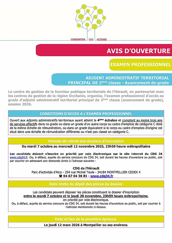 Le centre de gestion de la fonction publique territoriale de l’Hérault, en partenariat avec les Centres de gestion de la fonction publique territoriale de la région Occitanie, organise en 2026, l'examen professionnel d'accès au grade d'adjoint administratif territorial principal de 2ème classe, par avancement de grade, session 2026.