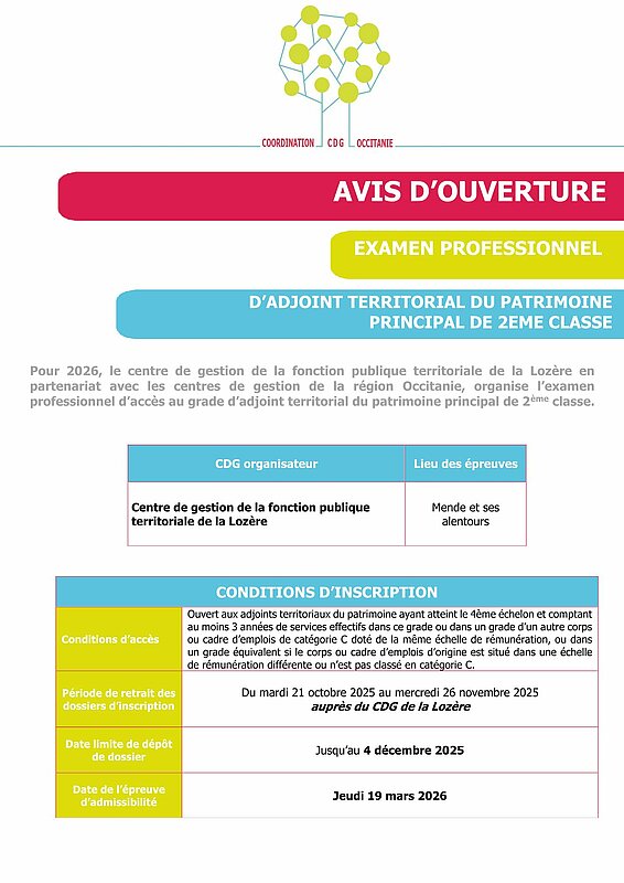 Le centre de gestion de la fonction publique territoriale de la Lozère, en partenariat avec les Centres de gestion de la fonction publique territoriale de la région Occitanie, organise en 2026, l'examen professionnel d'accès au grade d'adjoint du patrimoine territorial principal de 2ème classe, par avancement de grade, session 2026.