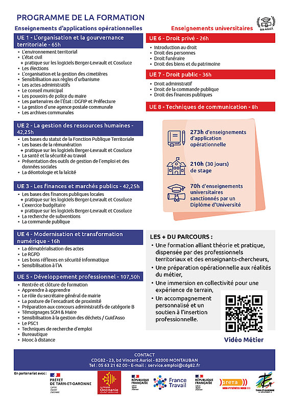 Le CDG82, initiateur et coordinateur de ce dispositif innovant, adresse ses sincères remerciements à l’ensemble des partenaires ayant contribué à sa réussite : la Préfecture de Tarn-et-Garonne, pour l’impulsion, la supervision du projet, son soutien financier et la mise en relation avec le Doyen Monsieur THIOYE Moussa et Madame FABAS-SERLOOTEN Anne-Laure de l'Université Toulouse Capitole et de l'antenne de Montauban, pour la mise en œuvre du D.U. en juin prochain, France Travail, pour la pré-sélection de candidats et son appui financier, le GRETA Midi-Pyrénées Nord, pour son accompagnement clé dans la gestion administrative du dispositif, la Région Occitanie pour son soutien financier et le Conseil départemental de Tarn-et-Garonne pour l’accès des stagiaires au Restaurant Universitaire. Sans oublier les communes du département qui accueilleront les stagiaires lors des 30 jours d’immersion professionnelle.