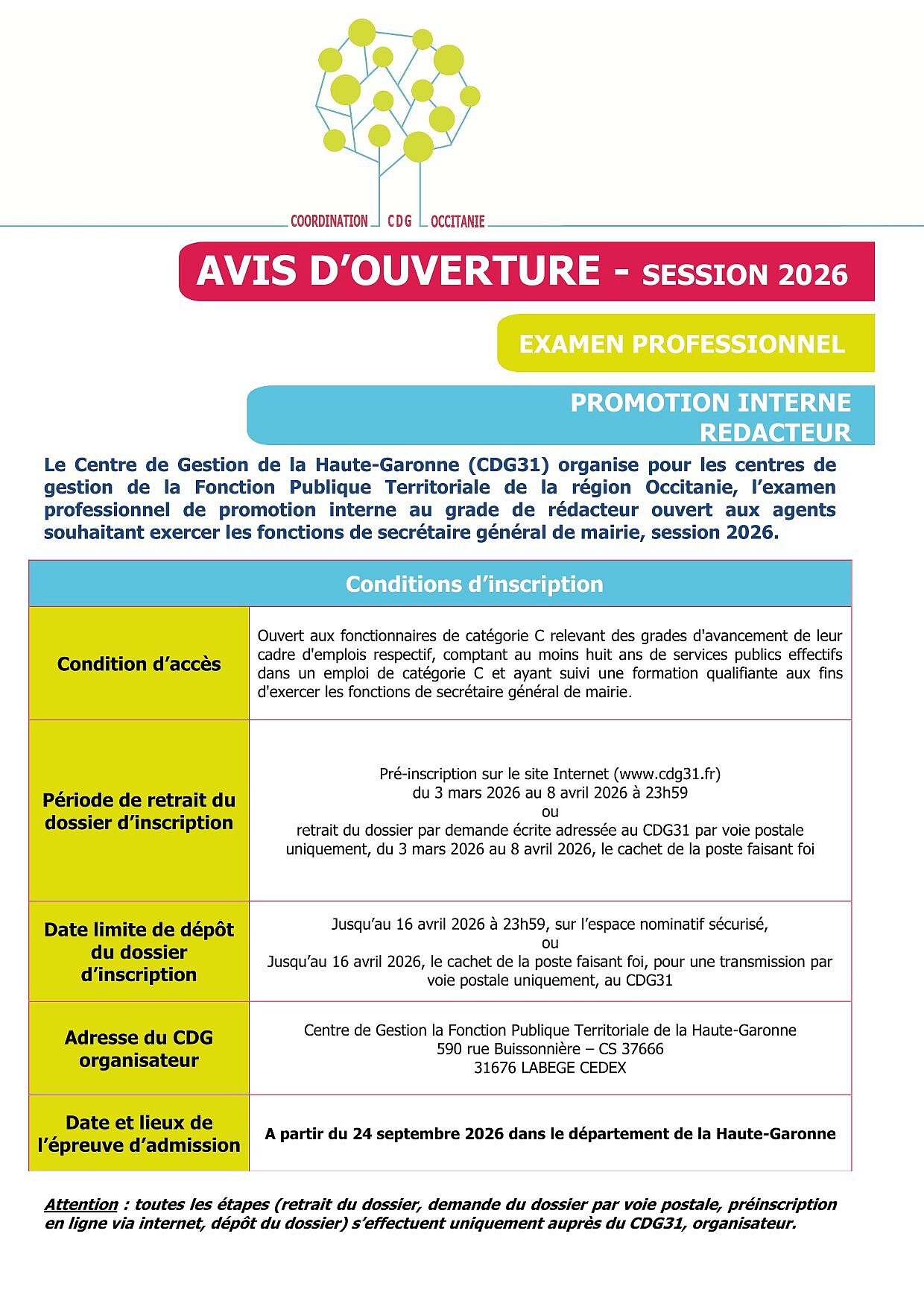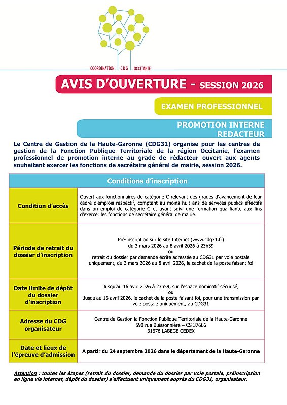 Le centre de gestion de la fonction publique territoriale de Haute-Garonne, en partenariat avec les Centres de gestion de la fonction publique territoriale de la région Occitanie, organise en 2026, l'examen professionnel de promotion interne de rédacteur ouverts aux agents souhaitant exercer les fonctions de secrétaire général de mairie, session 2026 .